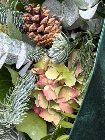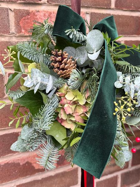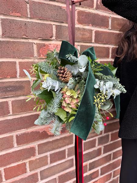 Bring festive charm to your home with this traditional Christmas kissing ball — a beautiful alternative to mistletoe. Handcrafted with lush seasonal foliage, aromatic spruce, and touches of ivy or holly, it’s finished with decorative ribbons, pinecones, and berries for a touch of sparkle. Perfect for hanging in doorways, porches, or hallways to welcome guests with a little Christmas magic.