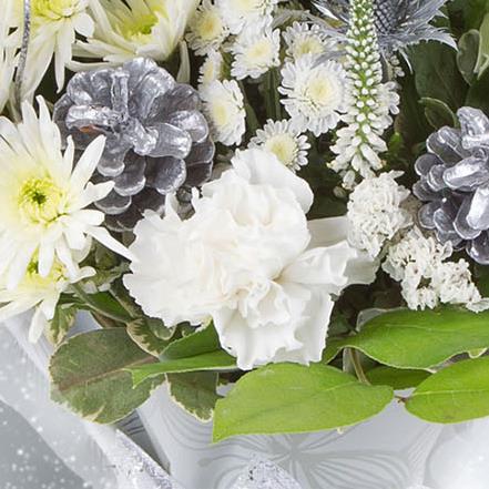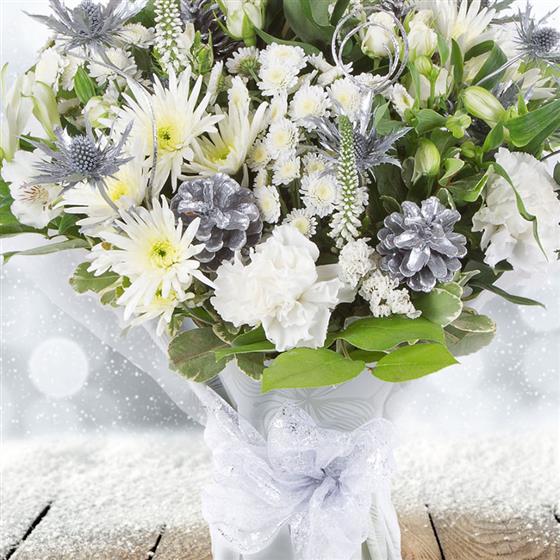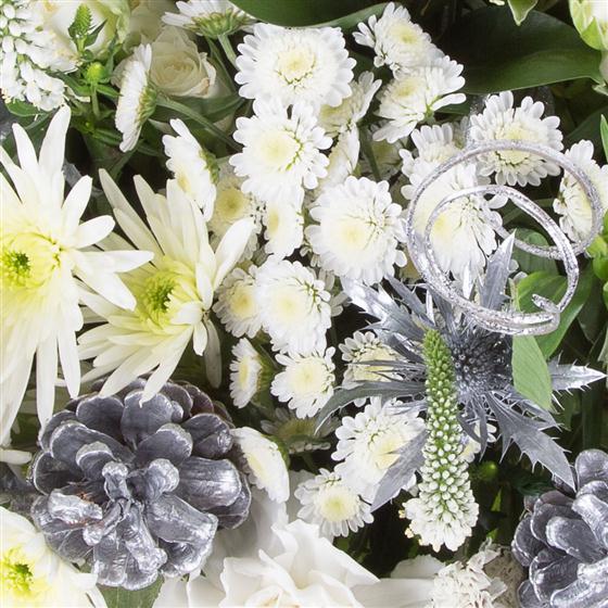 A stylish bouquet of all white blooms, including roses and carnations plus the freshest florist choice blooms intermingled with silver eryngium and eucalyptus.