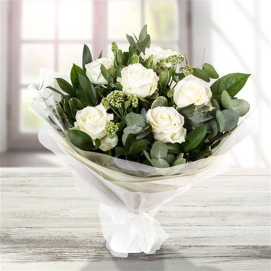 Six long stemmed white roses mingled with mixed foliage presented in water.