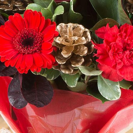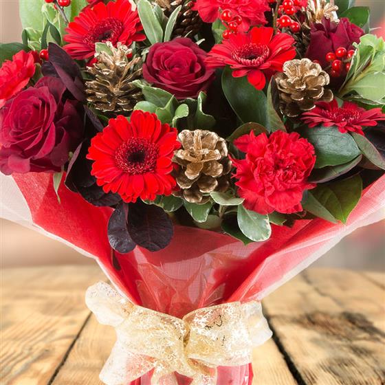 A striking all red hand-tied aqua bouquet of roses, gerberas, carnations and berries including golden cones. This is the one if you're looking to treat somebody this festive season.