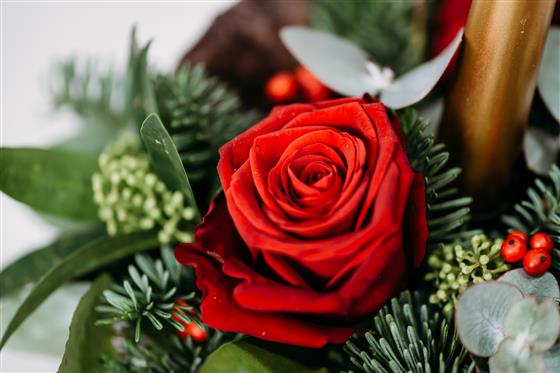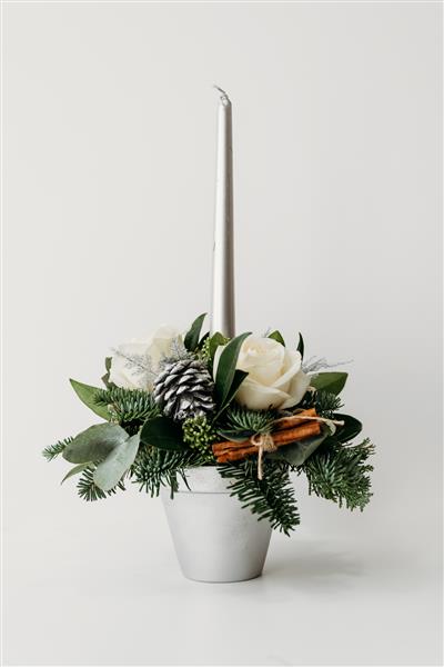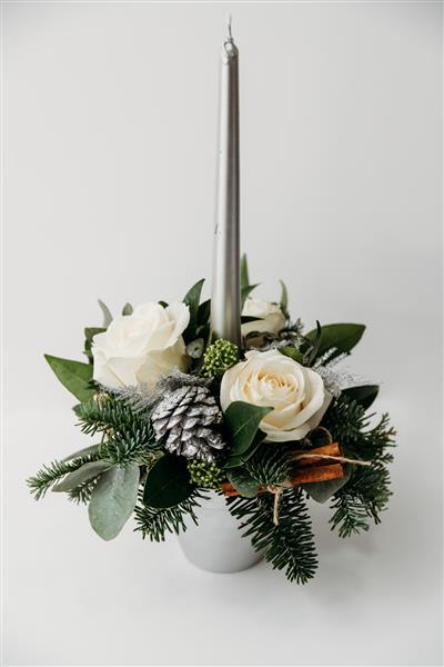 Do you want luxury but don't need big, then this festive table arrangement is for you! Our hand sprayed terracotta pot is full to the brim with fresh Irish Spruce, Skimmia and eucalyptus, then dressed using the iconic red Naomi rose or the white avalanche rose and finished with lots of lovely natural decorations and a gold or silver taper candle! Is one enough? We'll let you decide!