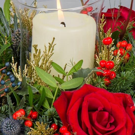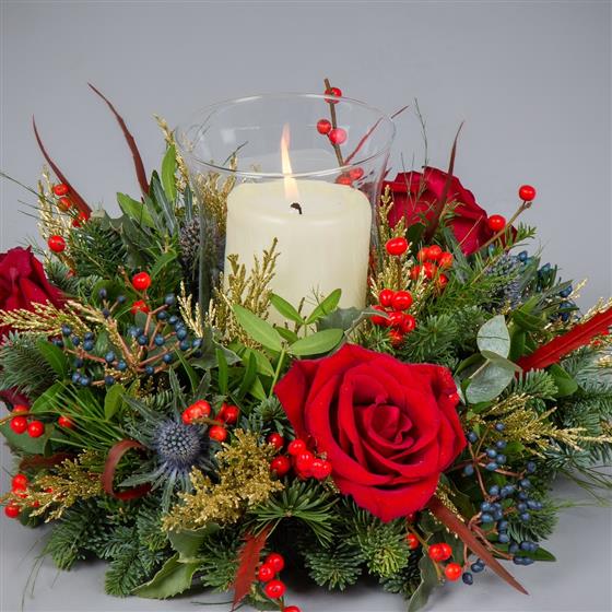 We think this may be our most popular Christmas centre piece!!! Jam packed with luxury festive foliage, berries, cones and the finest roses PLUS this design comes complete with a glass hurricane vase and pillar candle! Go on treat yourself!