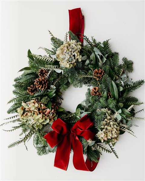 If you're looking for an authentic wreath, packed FULL of foliage, The Evergreen is for you!!! Our hand mossed wreath ring is adorned with the finest materials think Irish Spruce, Irish Eucalyptus, pine, skimmia and more! We then add in 3 gorgeous hydrangea's which dry beautifully, some pinecones and finish her off with our luxury velvet ribbon! We just know you're going to love her!