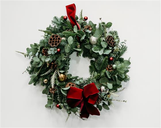 If you like a touch of bling, nothing too blingy, that's not our style, but baubles, well we think they add a classy bit of pizzazz to the proceeding, The Modern One may well be the wreath for you! Our hand mossed base is adorned with a range of lush foliage, think fresh Irish spruce, Irish eucalyptus, pine and more we then add in a range of varying sized baubles, pinecones lotus seed pods and of course our luxury velvet ribbon! What's not to love!