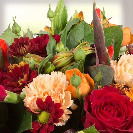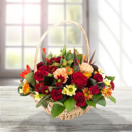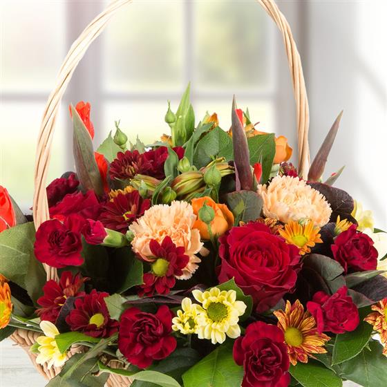A rich mix of deep reds, rusts and seasonal foliage arranged in a wicker basket! This is the perfect for gift for somebody to recieve if they are not really up to arranging a bouquet as they can simply display and enjoy with a little misting every day